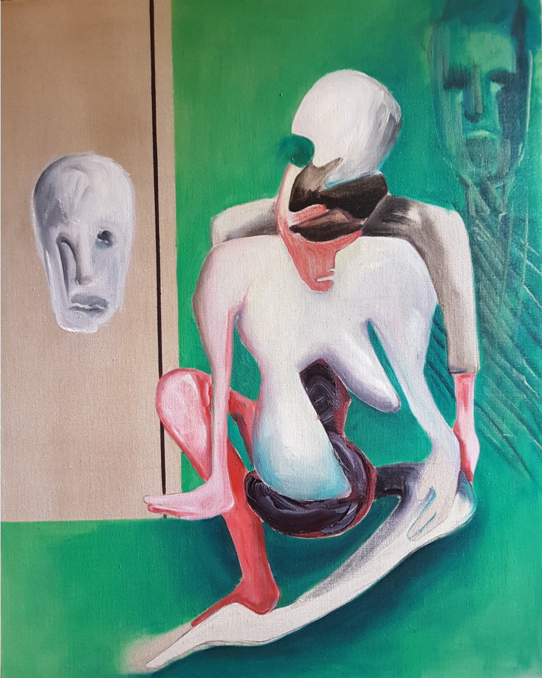 Des corps simples, des visages tout juste esquissés, un geste qui nous relie au corps qui peint. Oui, la peinture de Gifty est habitée et elle nous regarde.