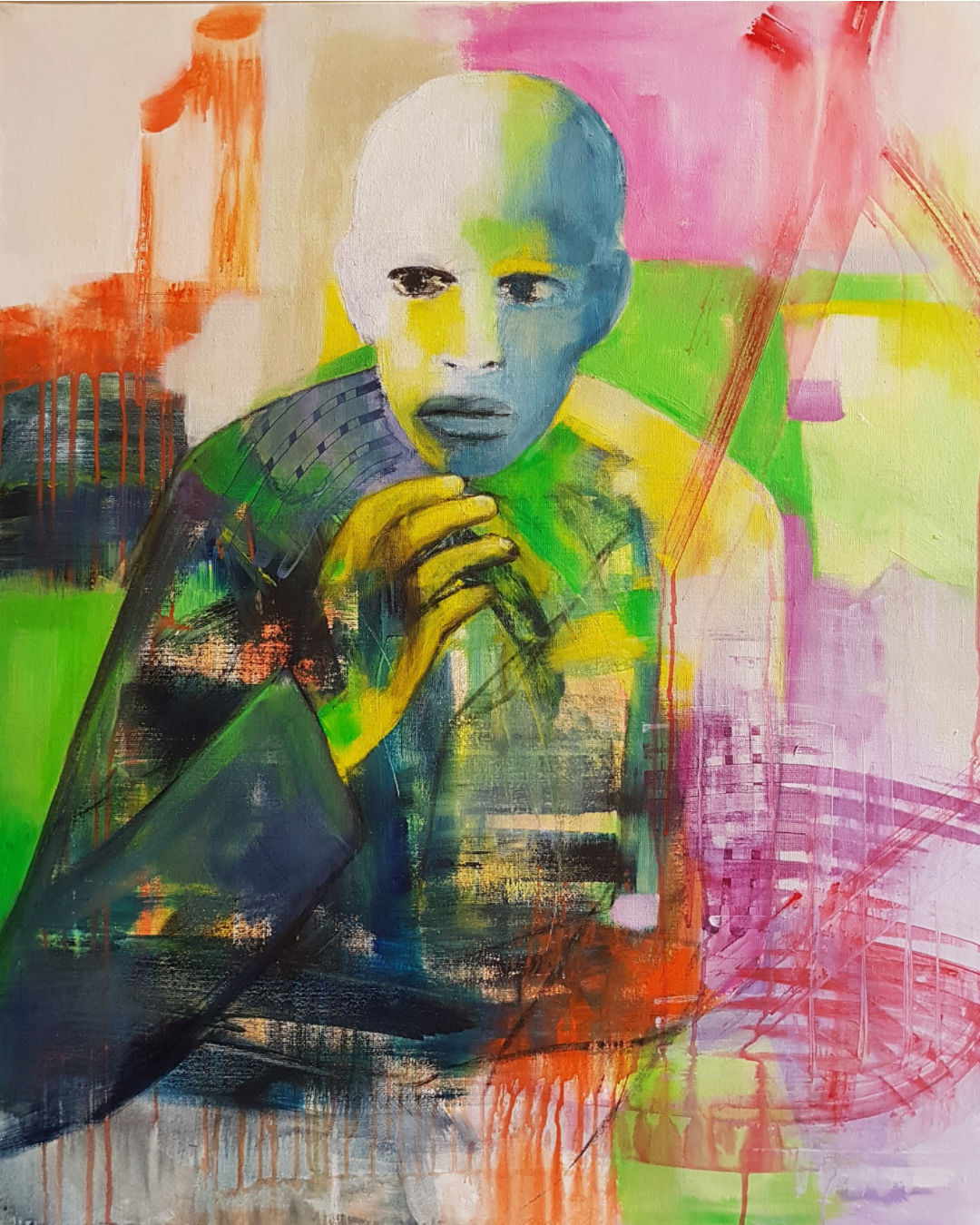 Striving beyond that of a simple notion, the complexity of Gifty’s work is what creates meaning. Her subject is at the center of all her questions. Harsh, frontal compositions are absent of decor, displaying the human in all his mystery and in all his truth. The visual aspect is refined without added details. Smooth streaks of paint are distributed in bold layers. The simple components of such an atmosphere could perhaps be considered an artist’s caution. However, what seems like a weightless surface is Gifty carefully and cleverly allowing one to acknowledge her work. Choice of color confirms her modesty, particularly in works where only shades of black and gray are present. In the end, her style lends meaning with a certain grace and tact which cannot be defined. It is simply felt.